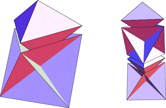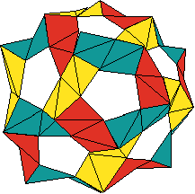 This is a very simple, three-piece modular that makes an interesting hexahedron shape. Students are asked to calculate the volume of this solid, assuming that we started with square pieces of paper with side length one. The answer might be a little surprising and can lead to discussions on how to dissect the cube in interesting ways.